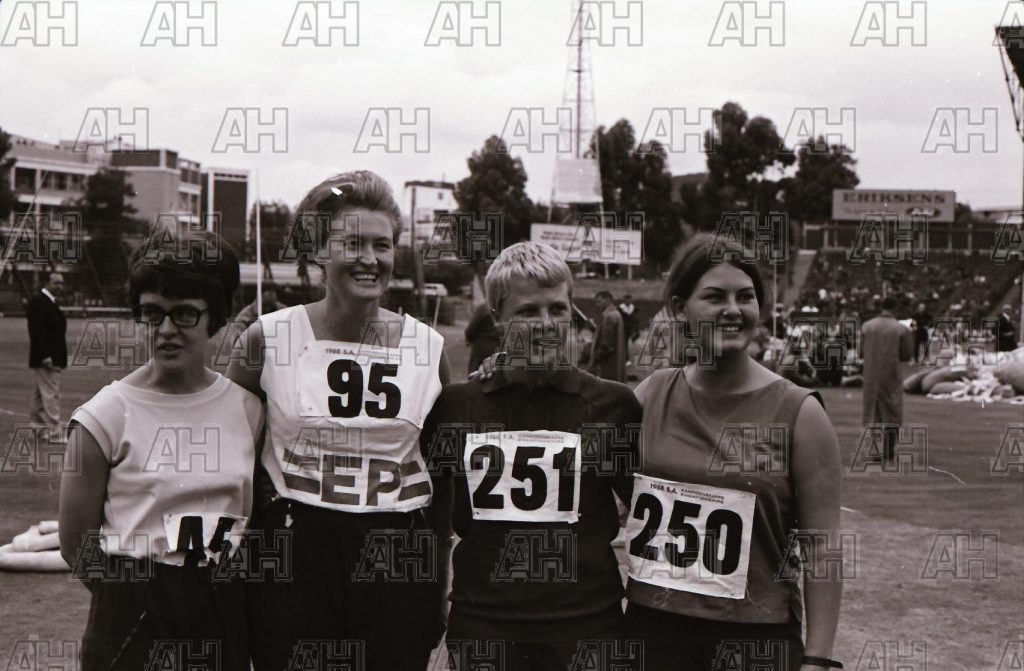 Image ID: 201802281748_00023 athletephotobase 8 years ago SA Championships April 1968, Laetitia Grove, Janet van Lingen, Teresa Louw, Pamela Meyer
